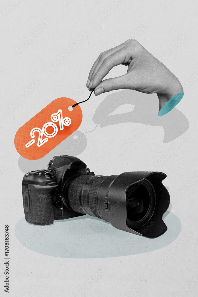 Sketch image trend artwork 3D photo collage of hand hold percent store sale advertisement shopping rebate low price camera shooting hobby