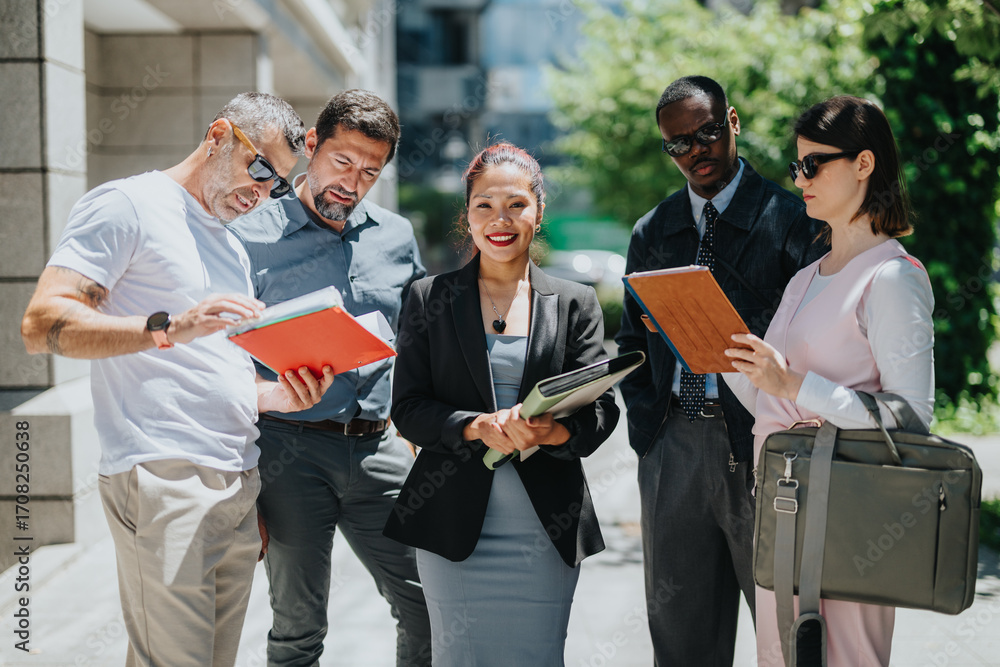 A team of multi-ethnic business coworkers discussing work while outdoors in a casual setup. Highlighting teamwork, collaboration, and diversity.