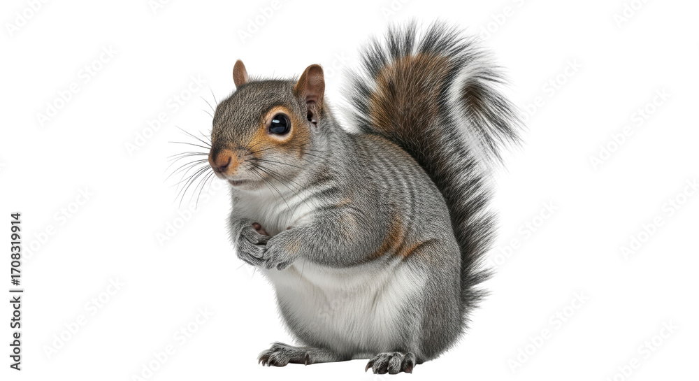 Isolated Cute squirrel standing on two legs and holding something in its paws studio shot