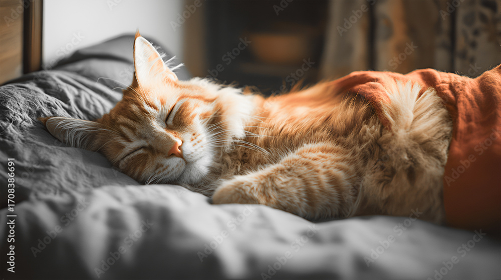 Orange tabby cat peacefully sleeping on a cozy bed with soft blankets and warm lighting