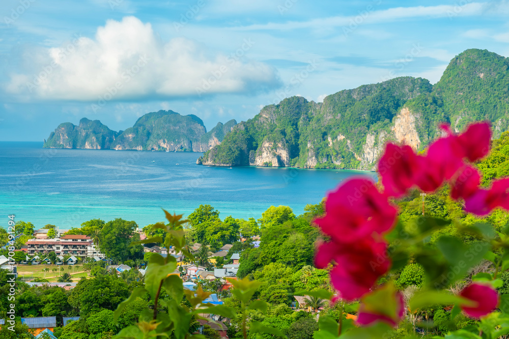 Aerial view of turquoise water bay of tropical island Ko Phi Phi Don in Andaman sea, Krabi, Thailand with bougainvillea flower on foreground. View from above. Popular touristic vacation destination