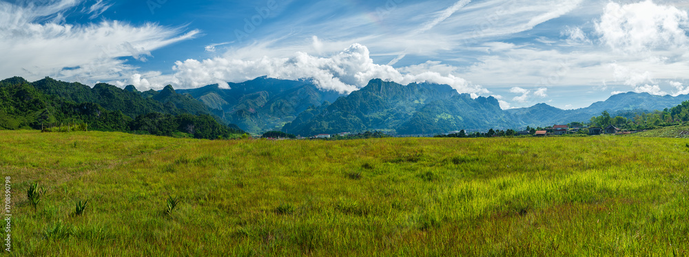 Scenic view of the grass field lawn with peaceful Mountains, Beautiful Scenery landscape with green hills in spring time. illustrating the idea of travel, tourism or exploring