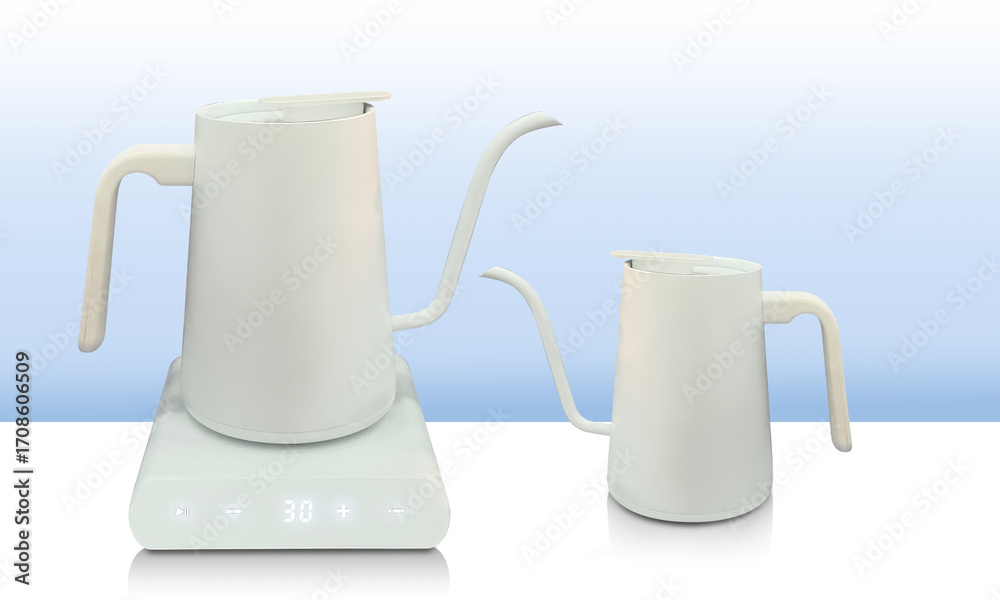 side view white electric kettle on a white electric stove and side view small white electric kettle on white floor, gradient white and blue wall background, technology, object, electric , copy space