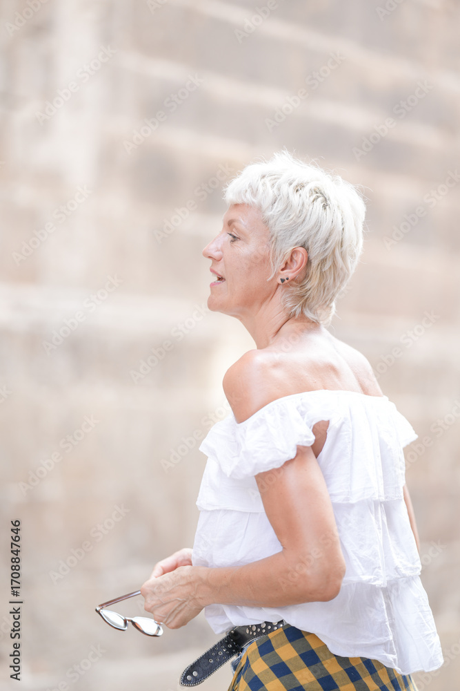 A woman wearing a white shirt and yellow and blue plaid pants is holding a pair of sunglasses