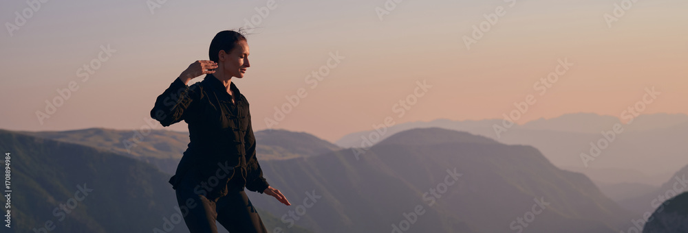Woman practicing Tai Chi in traditional black outfit on mountain at sunrise, arms outstretched in meditation pose focusing on balance, energy, and mindfulness in nature.