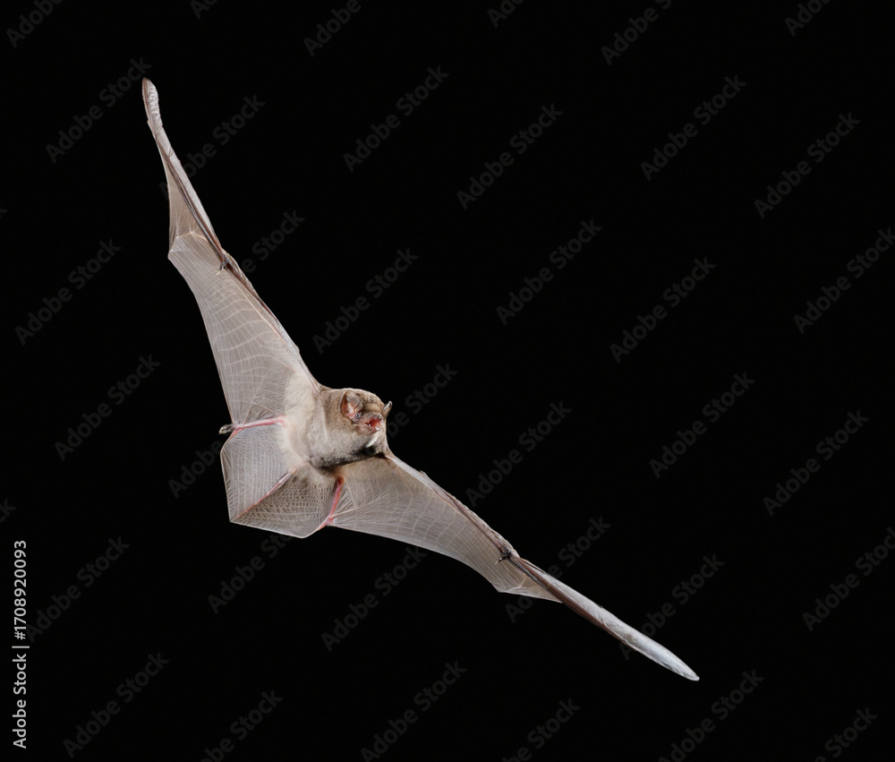Least long-fingered, or bent-winged bat (Miniopterus minor) flying, Kilifi county, coastal Kenya.