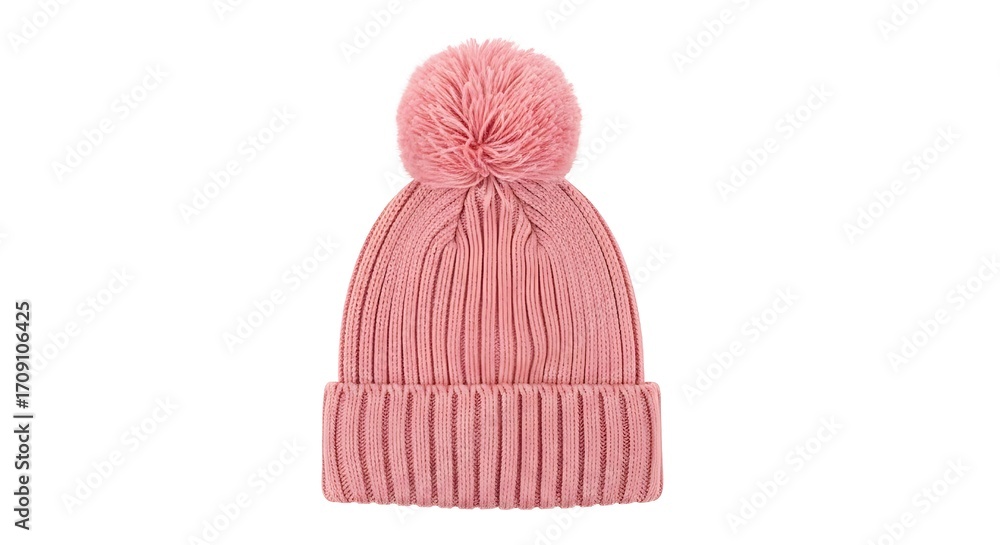 A cozy pink knitted beanie hat with a fluffy pompom, isolated on white background, perfect for winter fashion and warmth, showcasing its soft texture and stylish design for cold weather