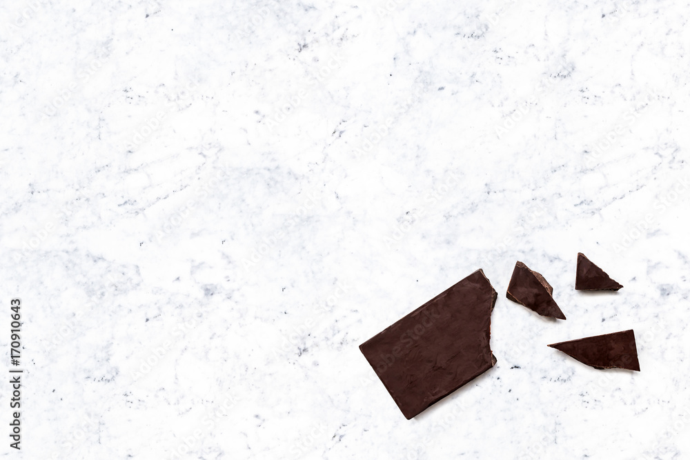 Broken dark chocolate bar isolated on a white marble kitchen top. Horizontal composition. Top view