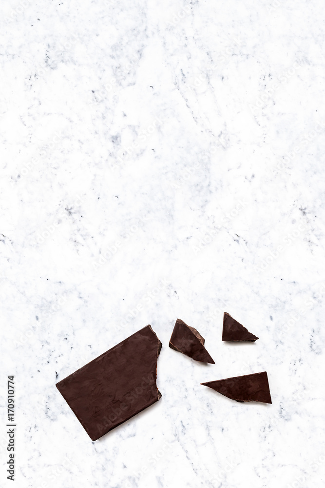 Broken dark chocolate bar isolated on a white marble kitchen top. Vertical composition. Top view