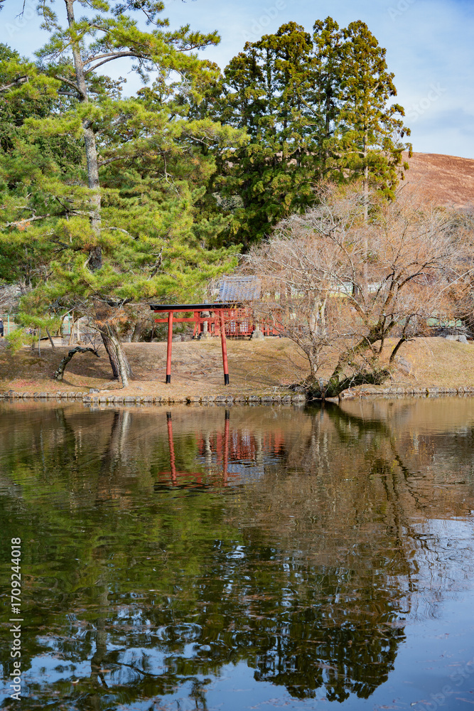 Torii gate reflected in lake amidst forest in Nara Park, Japan”