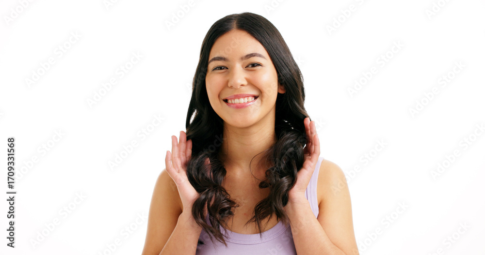 Portrait, hair care and woman in studio, smile and confidence on white background. Space, beauty and person with happiness, shine and glow with keratin treatment, grooming and pride with texture