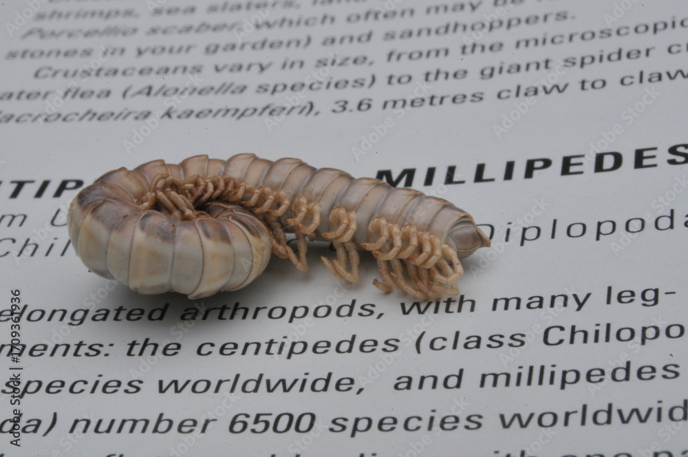 Insect textbook entry for a millipede, featuring an actual millipede.