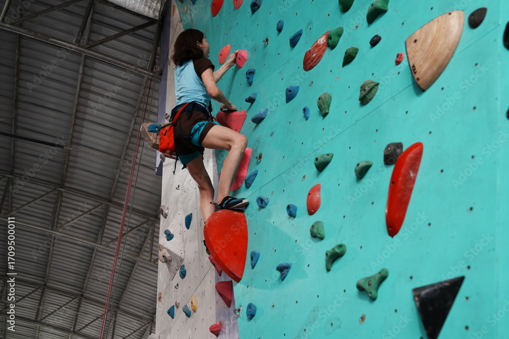 Senior Asian woman exercising and practicing rock climbing in gym. Extreme sports and health concept.