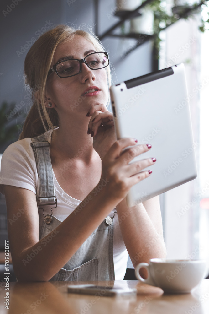 Examining her new tablet. Attractive smiling woman using digital tablet while sitting in restaurant near the window