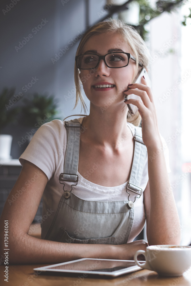 Carefree talk with friend. Cheerful young woman talking on phone and smiling while enjoying coffee in cafe