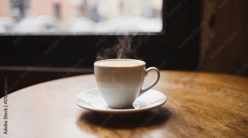 Steaming cup of coffee on a wooden café table. Warm daylight, cozy atmosphere, soft steam rising, professional 35mm photography style, perfect for branding, lifestyle, and food concepts.