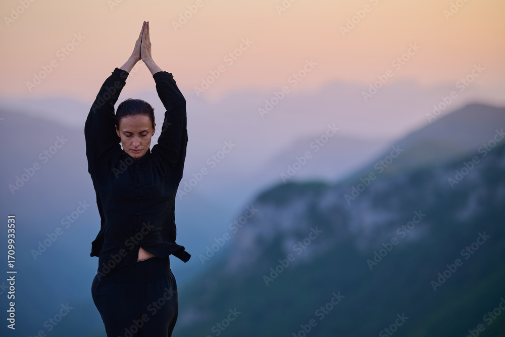 Woman practicing Tai Chi in traditional black outfit on mountain at sunrise, arms outstretched in meditation pose focusing on balance, energy, and mindfulness in nature.