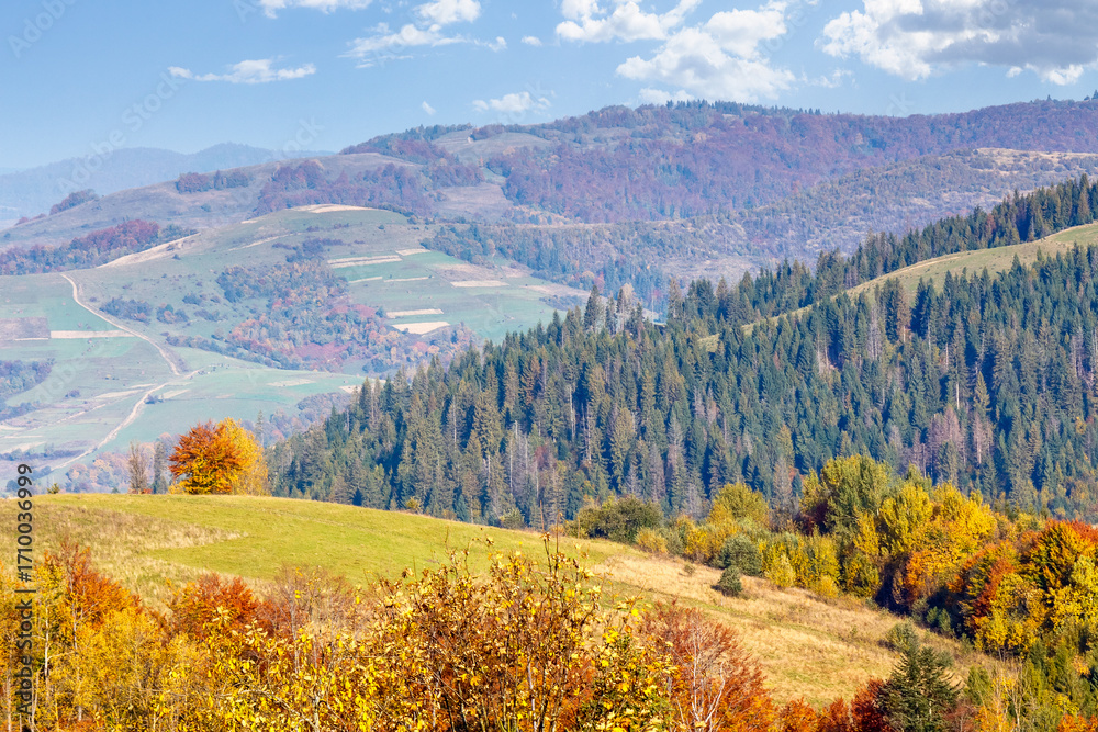 countryside mountain landscape in autumn on a sunny morning. trees in colorful foliage on the hill. rustic scenery under cloudless blue sky. travel carpathians in fall season