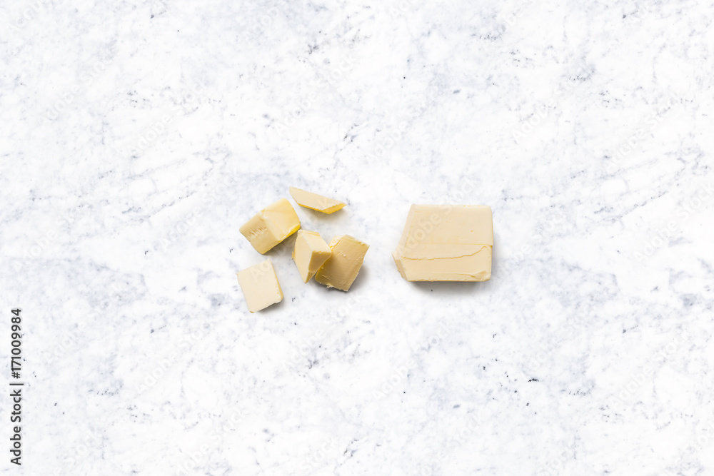 Organic Butter isolated on white marble kitchen top. Horizontal composition. Top view