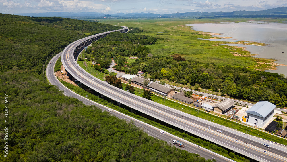 Drone shot The M6 motorway Nakhon Ratchasima Province - Bang Pa-in Lam Ta Khong River and Mountain. Motorway Korat Thailand