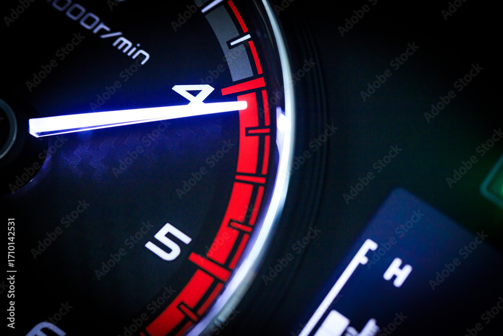 Close-up of a diesel truck's dashboard and tachometer. It represents the power and durability of a work vehicle, with a clear focus on the round engine meters.