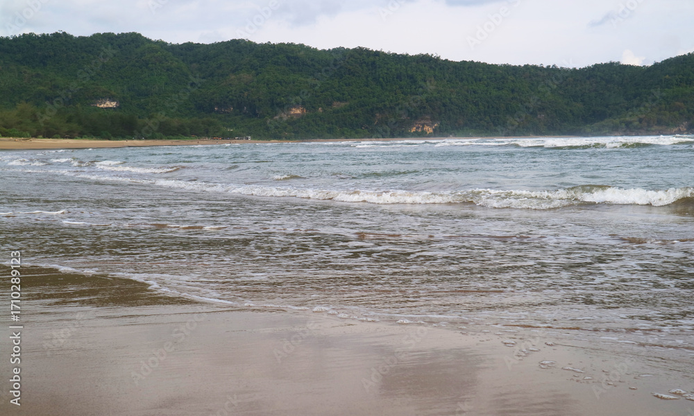 Sandy beach with rolling waves and a verdant hill. Calm ocean, lush nature, and peaceful landscape.