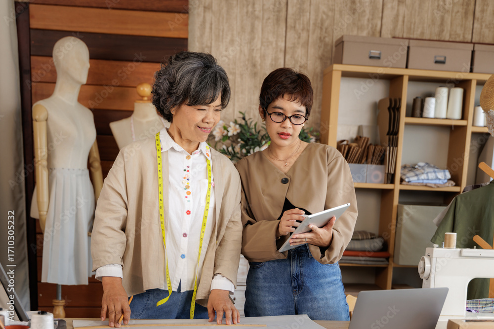 two Asian women working together in a clothing design studio.