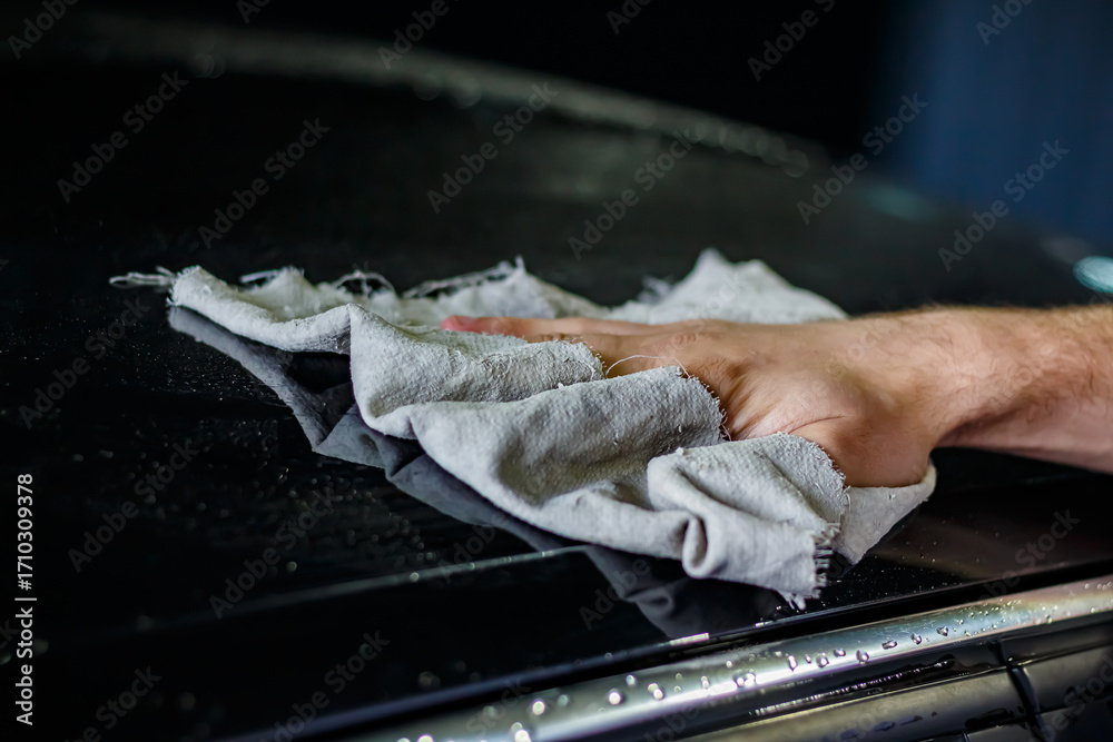Hand polishing a car hood after washing: car body care, clean surface, detailing.
