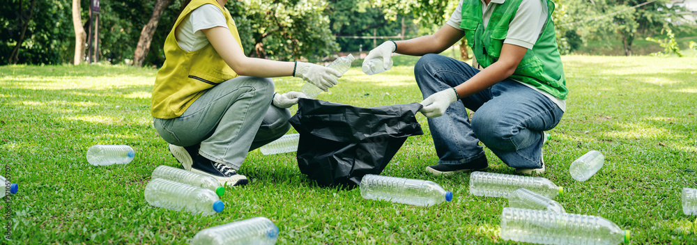 Dedicated environmental volunteers gather plastic bottles for comprehensive park cleanup promoting recycling and sustainability in outdoor green spaces