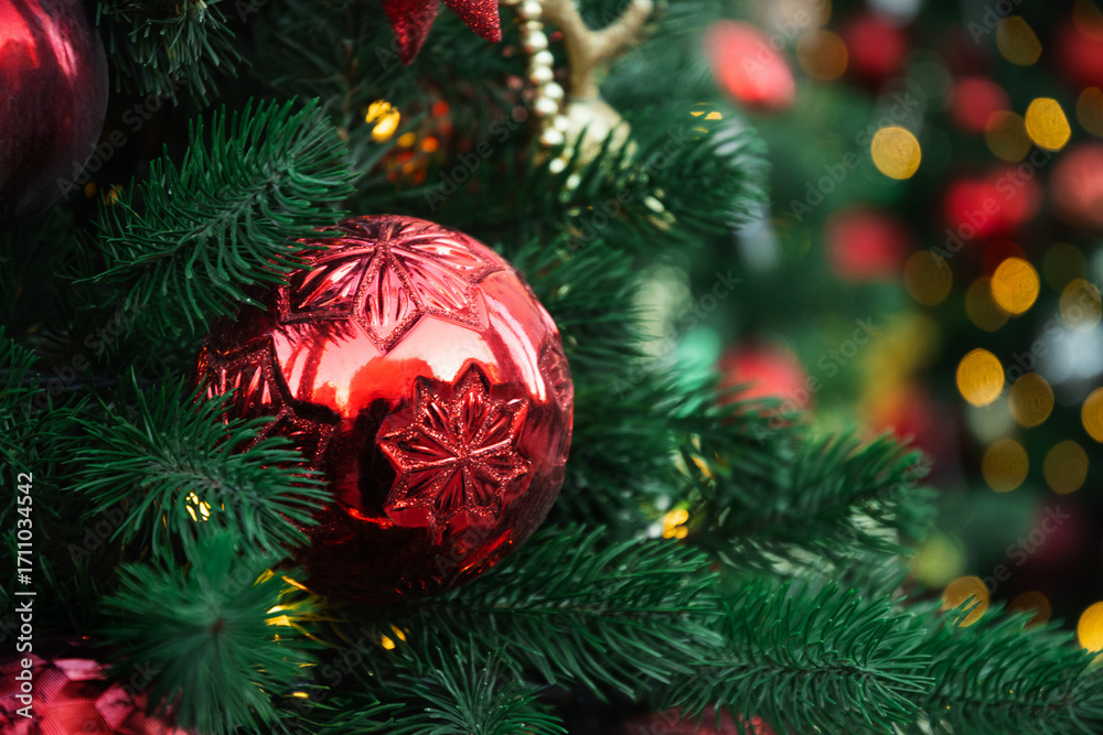Christmas tree with red ball and lights garland. Xmas card. Close up. Winter holiday spirit. Outdoors.