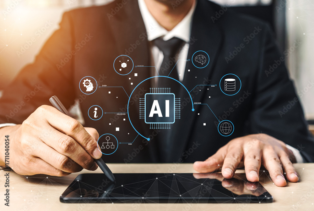 Artificial Intelligence (AI) as a core technology. A concept of an AI ecosystem powering data analysis, machine learning, and global networks. Motif