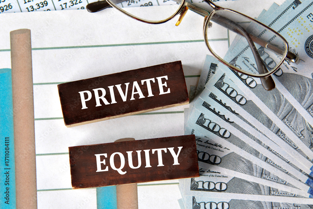 PRIVATE EQUITY - words on brown wooden blocks on the background of a graph and banknotes