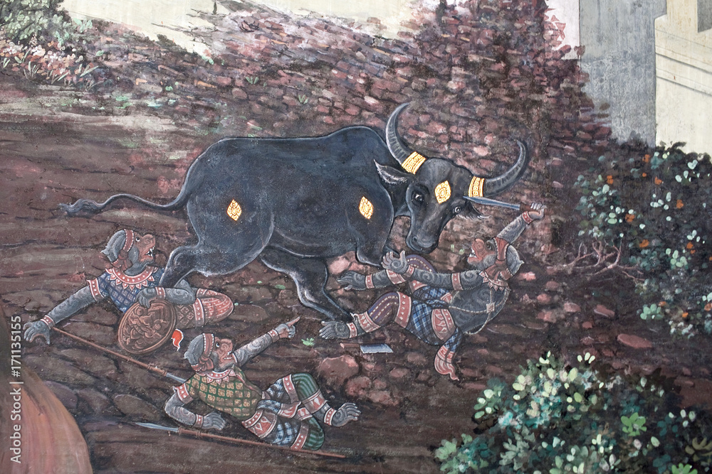 Ancient painted fresco in Wat Phra Kaew in Bangkok, Thailand