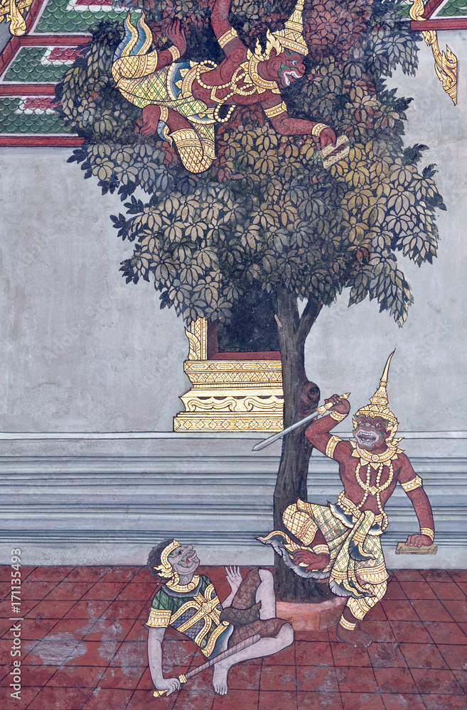 Ancient mural painting in Wat Phra Kaew Temple in Bangkok, Thailand