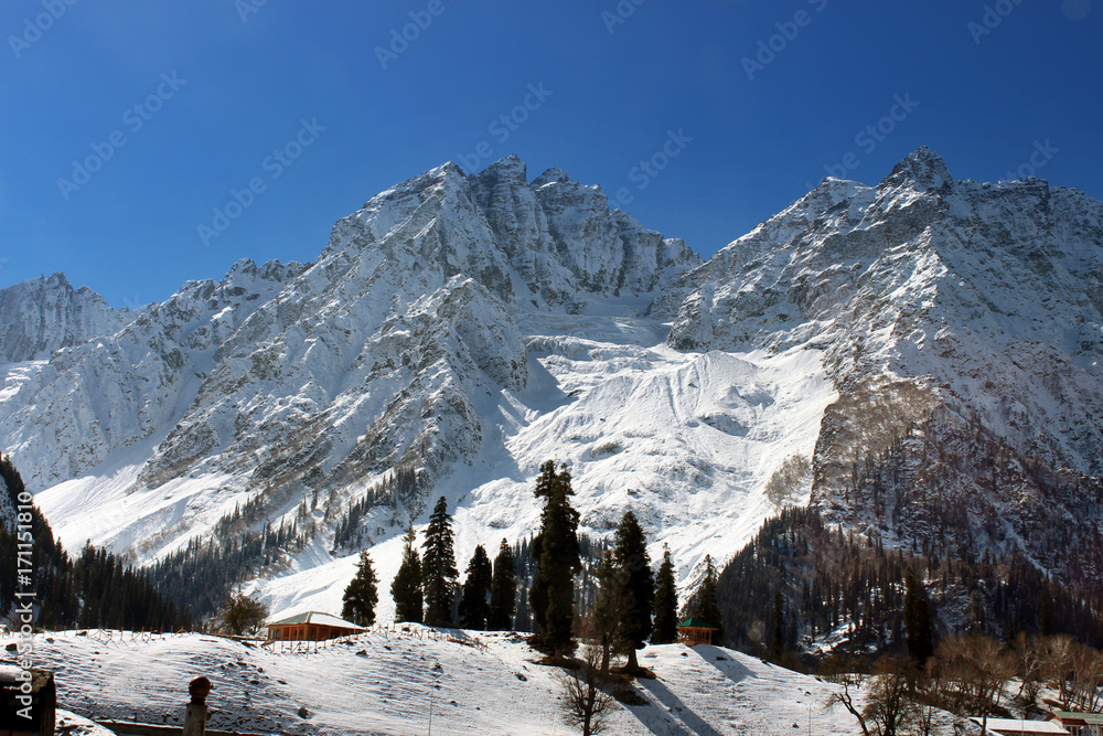 Snowy mountain valley at Sonmarg, Kashmir in India.