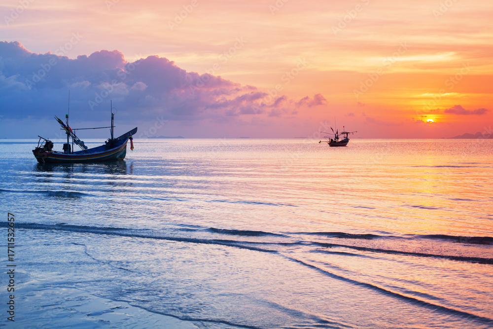 Sea sunset landscape, beautiful ocean sunrise, tropical island beach, fisherman boat, ship silhouette, blue waves, colorful pink red orange sky, water sun reflection, summer holidays, vacation, travel
