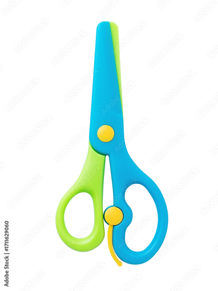 Multicolored plastic scissors safe for children isolated on white background, top view