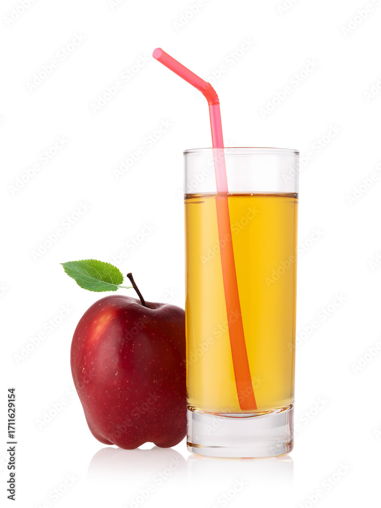 Apple juice with a straw in a glass and a whole red apple isolated on white background, design element