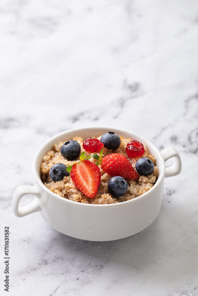Buckwheat flakes with strawberries, blueberries and dried cherries in white ceramic plate on table with copy space