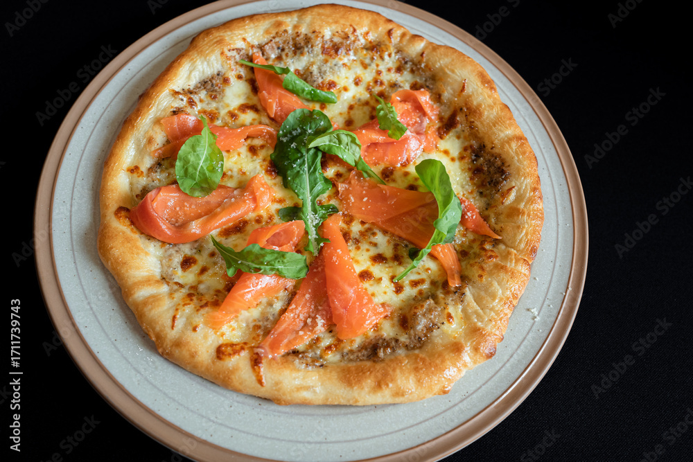 Salmon Pizza Delight: A mouthwatering close-up captures a gourmet pizza topped with fresh salmon, vibrant greens, and melted cheese, a true culinary masterpiece.