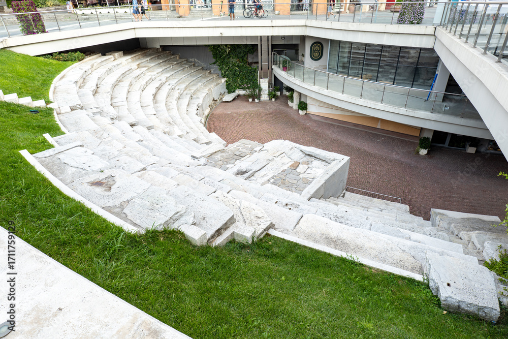 Plovdiv, Bulgaria - 09.05.2022: Ancient Roman stadium ruins beneath a modern plaza with the Dzhumaya Mosque .