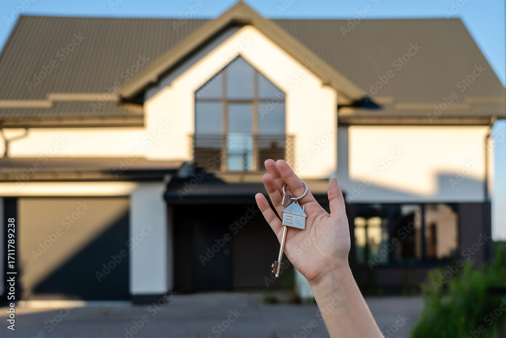 Hand holding a key in front of home. Leasing insurance and purchase concept. Real estate investment concept. Buying or renting