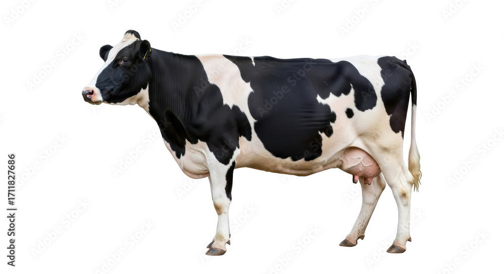 Isolated dairy cow standing in studio, Holstein black and white, farm animal mammal, long shot