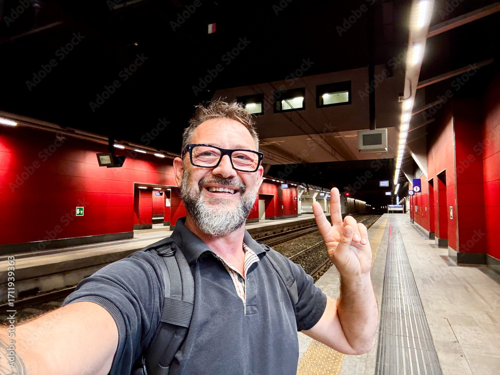 Middle-aged man taking selfie in underground train station, smiling and happy while waiting for subway or train, enjoying travel, urban lifestyle, freedom, adventure and everyday commuting moments