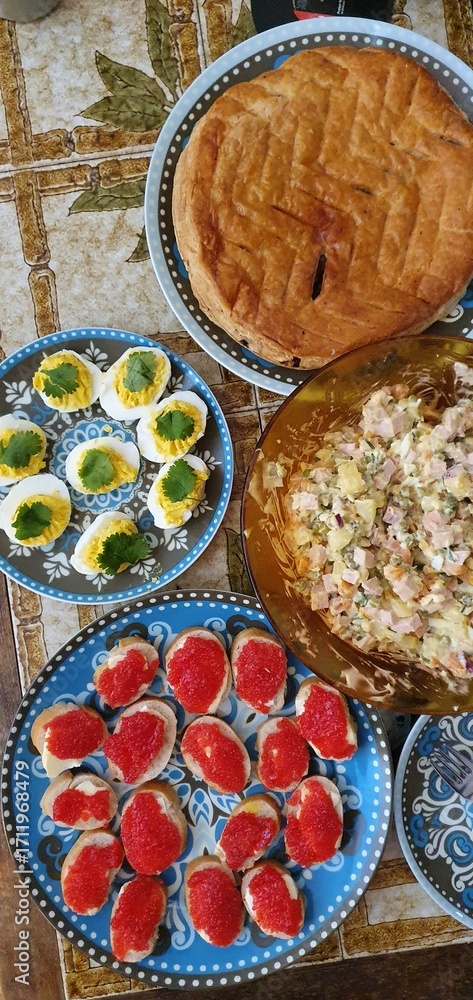 Russian French New Year food homemade, deviled eggs, caviar sandwich, olivie potato salad and galette des rois. Mobile photography, real phone snapshot