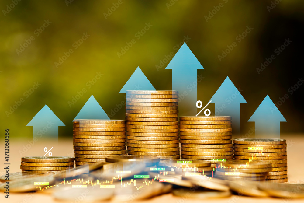 dividend and Interest rate concept. symbol and arrow pointing up on gold coins instead Return on Stocks and Mutual Funds long-term investment. income return retirement fund at stock market.