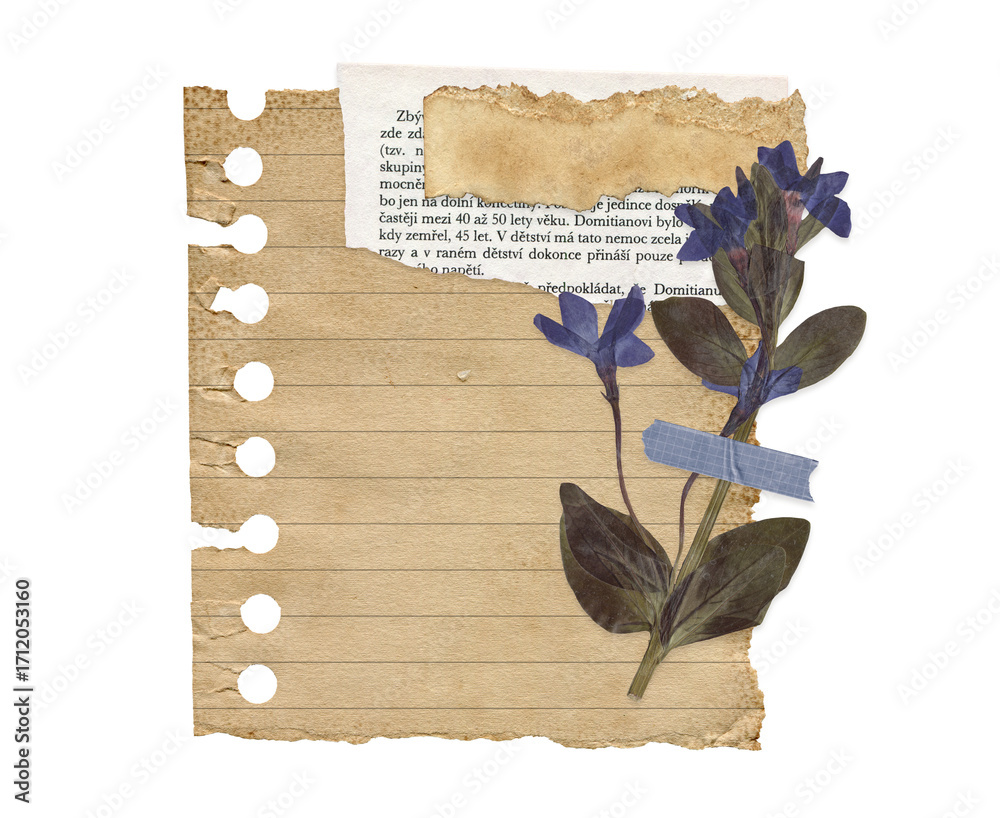 Retro Botanical Note with Dried Flower and Grunge Paper. Torn Aesthetic Notepaper for Scrapbook and Collages