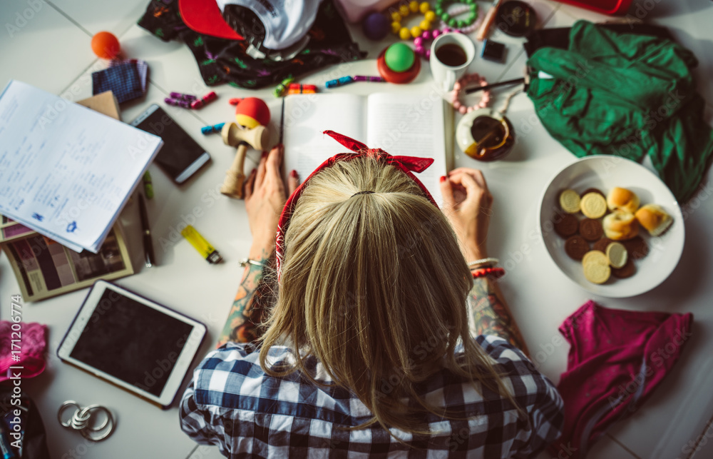 top view of young blonde woman in a bandana read a book lying on the floor. The mess in the room. Modern student