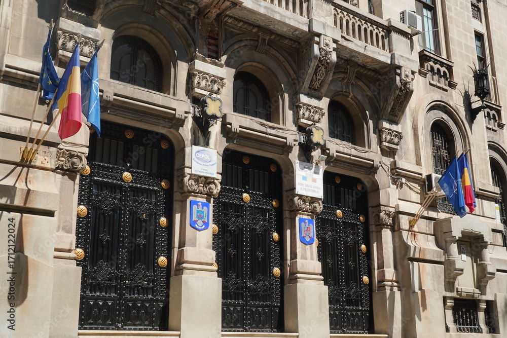 Bucharest, Romania – August 10, 2025: Facade of historic building, built between 1914-1926 in neo-romanian architectural style, nowadays headquarters of The General Inspectorate of the Romanian Police