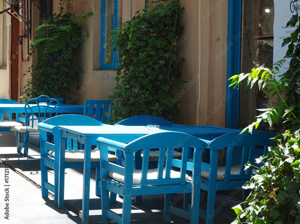 Light blue wooden furniture outdoor in the yard of small cafe in Bucharest